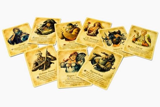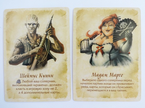 Персонажи случайным образом выбираются игроками перед началом партии. Каждый из них позволяет игроку либо взять больше карт, либо чем-то навредить соперникам (к примеру, один из персонажей обязывает соперников выкладывать после определенной карты - кракена - еще 4 карты (вместо двух), а это почти гарантированный провал рейда, то есть весь выкладываемый ряд с большой вероятностью отправится в сброс). Для взрослых - ничего сложного, главное - не забывать о свойстве своего персонажа и активно им пользоваться. Игра становится еще азартнее (но желательно, чтобы игроков было больше двух, то есть 3 или 4, так интереснее).