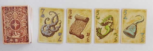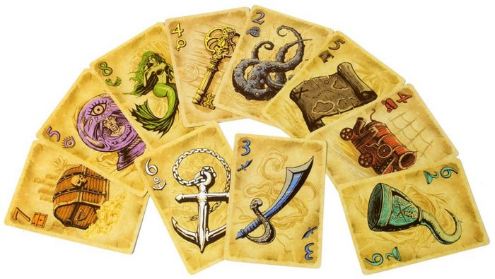 Карты - это пиратские трофеи, всего их 10 видов (по 6 шт), но каждая имеет свою стоимость (от 2 до 7).