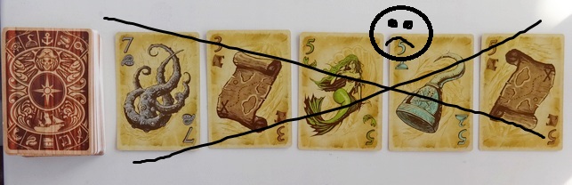 Но как только в выкладываемом ряду появляется карта, которая уже присутствует в нем, игрок теряет все эти трофеи и отправляет карты в сброс (то есть ничего не удалось награбить). Вот перед открытием каждой последующей карты и надо решать - рискнуть и, возможно, получить больше (карт и очков в конце игры) или же не гнаться за количеством, но зато гарантированно положить в свой тайник хоть что-то (хотя соперники и из тайника вытащить могут).