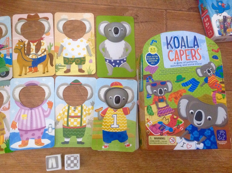 "Коала". Цель бросая кубики определять сочетание вида одежды и узора и соответственно ищем карточку похожую с нарядом для коалы. Если выпадает кубик " трусы" коала раздевается и все начинается сначала. Играем до 5 одежек
