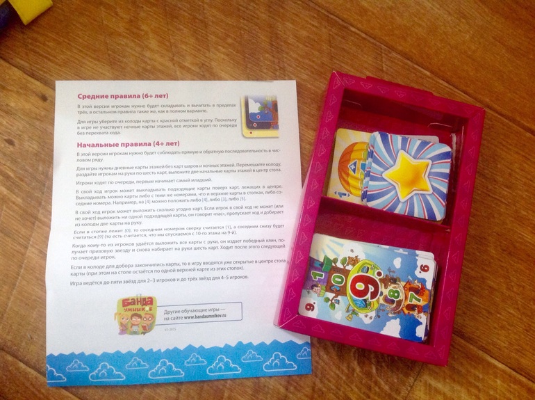 1. Самый наш хит "Этажики" от Банды умников. На коробке 4+, но у нас сразу пошел самый начальный вариант игры ( см правила). Суть раздаем по шесть карт и две в центр и выкладываем карты с тем же номером этажа или на единицу больше или меньше. Выиграет тот, кто первый выложит все свои карты. Победитель получает победную звезду. Играем до 5 звезд. Отлично закрепляет навыки счета и аналогия с лифтом идет на Ура. Игра отлично для дороги, тк компактная