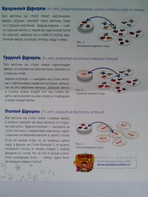 В игровом комплекте 96 фишек-жетонов. С одной стороны фишки - три ярких картинки, с другой написано слово. Фишки разделены цветом на два игровых комплекта: в первом, оранжевом, слова покороче, в синем - подлиннее. Есть три варианта правил: в самом простом читать не нужно - игроки наперегонки находят одинаковые картинки, развивая внимание и концентрацию. В среднем варианте нужно прочитать слово и найти фишку с соответствующей картинкой на игровом поле. В самом сложном варианте на поле лежат слова, среди которых нужно схватить то, которое соответствует одной из картинок на фишке игрока.