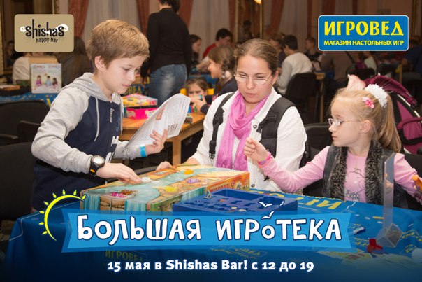 Приглашаем всех на Большую игротеку, которая состоится в Shishas Bar! Вас ждёт море замечательных настольных игр, интересные новинки, жаркие турниры и, конечно, лотерея с призами!Стоимость: бесплатно!