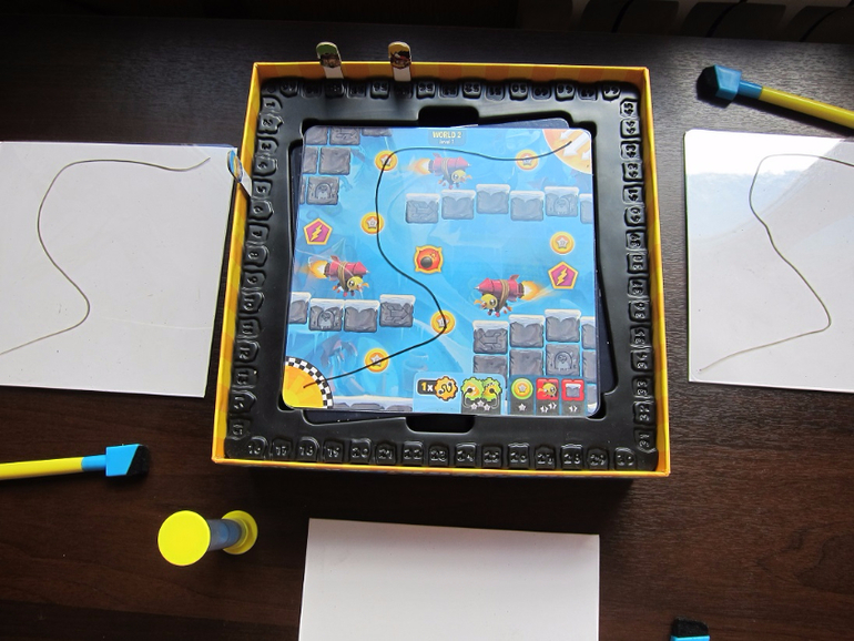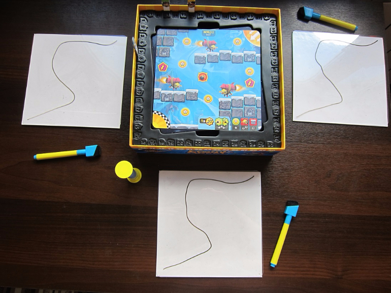 Коробка - это само игровое поле, в центре которого размещается карточка с заданием, а по периметру находится дорожка для подсчета очков. Каждому игроку выдаются подкладка, на которую кладется прозрачный экран, и маркер. Задача игрока за 30 секунд выполнить задание на карточке.