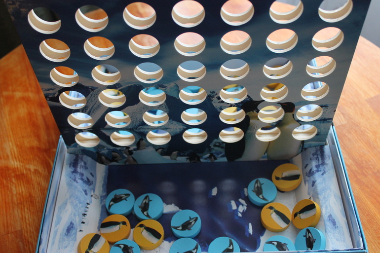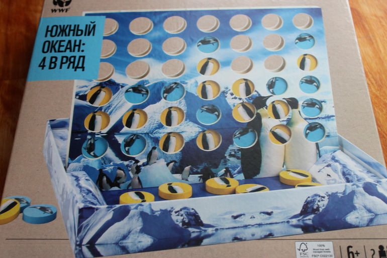 Меня подкупает то, как сделана эта игра. Она деревянная, фишки яркие, очень приятные, для одного игрока косатки, для другого пингвины. Правила игры просты. Она для двух игроков с 6 лет. Надо выстроить в ряд 4 фишки своего цвета. Играем я, мой муж и сын, ежедневно. Я проигрываю постоянно. Что делать, троих детей родила, потеряла 60% интеллекта