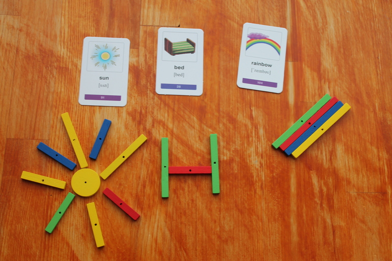 Итак, пишу как изготовить и адаптировать игру для детей возрасте около трех и выше. Я не привязывалась к количеству дисков и палочек, от этого ничего не зависит. У нас есть конструктор Чудо-молоток от Step puzzle, в нем есть достаточное количество деревянных дисков и палочек. Если у вас подобного ничего нет, используйте набор счетных палочек и круглых дисков, таких превеликое множество продается. Карточки с заданиями должны быть простые. Здесь я тоже не заморачивалась и взяла те, что были дома. У меня это Мои первые английские слова 333 слова с переводом от Айрис Пресс (Есть в Лабиринте). Из них я выбрала самые простые картинки, которые легко изобразить с помощью дисков и палочек. Кстати, сканы в сети я нашла, поэтому сама сканировать не стала. Ссылку дам обязательно в конце поста. Если у вас есть другие картинки, используйте свои.
