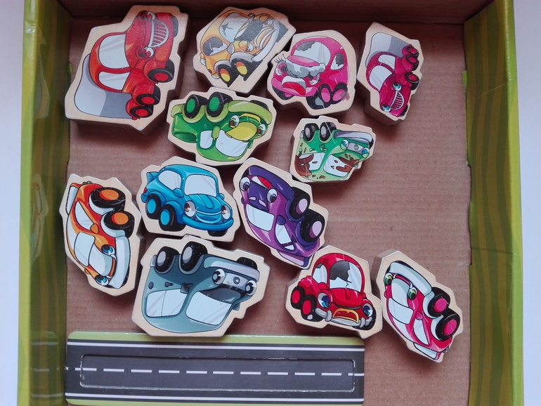 Что внутри коробки. На самом деле внутри был еще картонный вкладыш, но как-то он "сильно" мешал. Итак, игра состоит из подставки и 12 машинок разного размера. С одной стороны - машинки целые и чистые, с другой - разбитые и грязные.