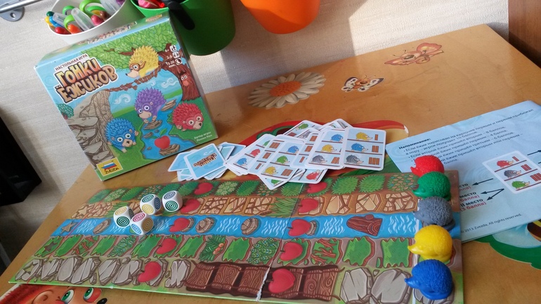 Когда я поняла, что больше не могу играть с Родионом в бесконечные ходилки, была куплена эта игра. Хоть на коробке указано 6+, но мы начали играть с четырех лет. Сначала играли в открытую, чтобы разобраться с правилами игры, потом Родька требовал исключительно зелёного ежа, приговаривая, что он скоростной). И вот в 4,5 года мы играем по "взрослому", никто не знает кому какая карта досталась. И наблюдая за ходами игроков, Родион делает выводы кто какого ежика ведёт к финишу. И тут можно попридержать чужого ежа, вернув его назад....![]()