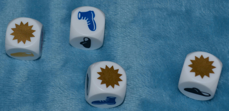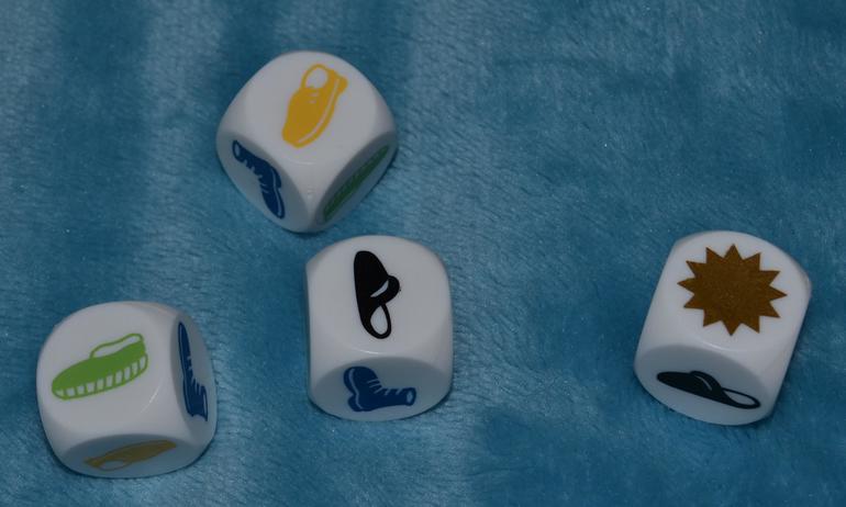 В наборе 4 одинаковых кубика. На каждой грани изображена обувь определённого цвета и так называемый джокер - он может быть использован как любой цвет по желанию.