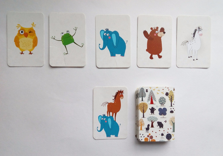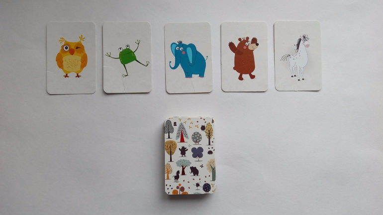 1. Карта, на которой изображено животное точно такой же расцветки, как на карте-препятствии. Это может быть оранжевая сова, зеленая лягушка, синий слон, коричневый медведь и белая лошадь.