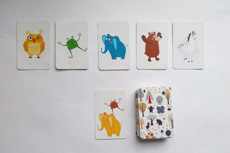 Начинаем играть. Самый младший игрок переворачивает верхнюю карту из колоды. Игроки должны положить свою руку на правильную карту животных. Какая карта будет правильной?