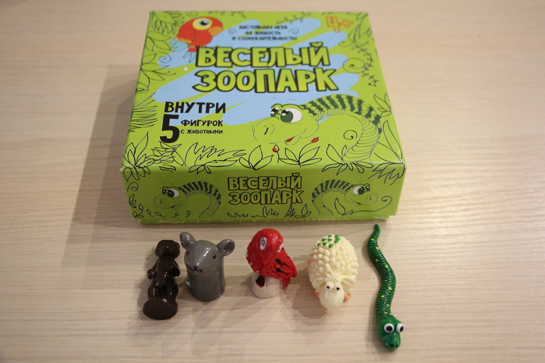 Фигурки такие: коричневый медведь, серая мышь, красный попугай, белая овечка, зеленая змея.