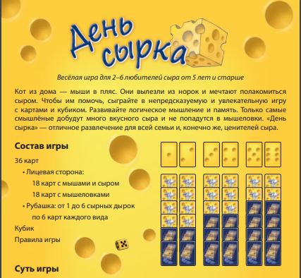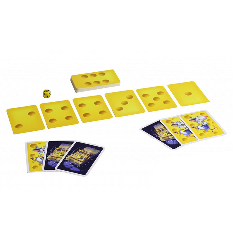 Игрокам карт не раздают. На кон выкладывается 6 карт рубашкой вверх. На рубашках изображены точки (сырные дырки) от 1 до 6. Игроки по очереди бросают кубик и тут начинается самое интересное! При наличии на кону карт с обозначенным количеством очков, игрок либо забирает такую карточку себе, либо (не глядя) откладывает ее в стопку сыгранных. Если же карты с таким количеством точек на кону нет, игрок может аккуратно подсмотреть какую-нибудь карту.