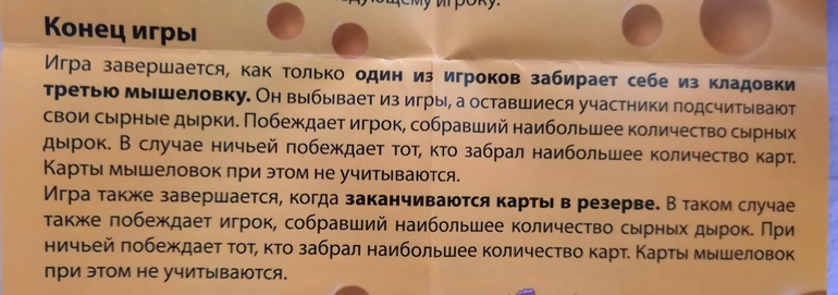 В чем же подвох? На обороте карт изображены либо мышки, либо мышеловки. Если забрал себе три мышеловки - проиграл. Среди выигравших или (если таковых нет, но карты закончились) начинается подсчет очков. Игрок с большИм числом точек на рубашках побеждает в игре.