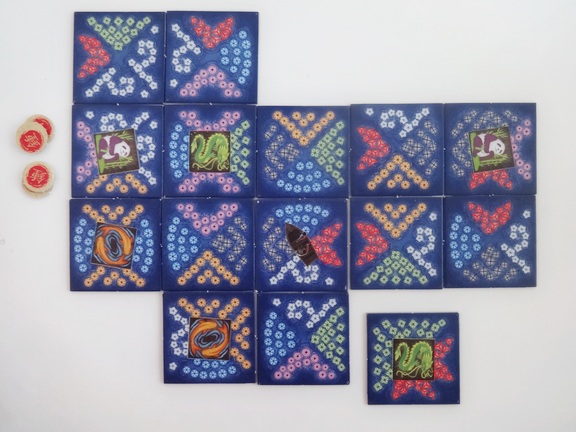 Если на руках для создания узора-сета не хватает фонарика определенного цвета, его можно получить путем обмена. За выставление фрагментов озера с плотиком в центре игрок получает 1 жетон поощрений ("монетка" с китайским символом), а накопив и отдав 2 таких жетона, можно обменять 1 свой фонарик.