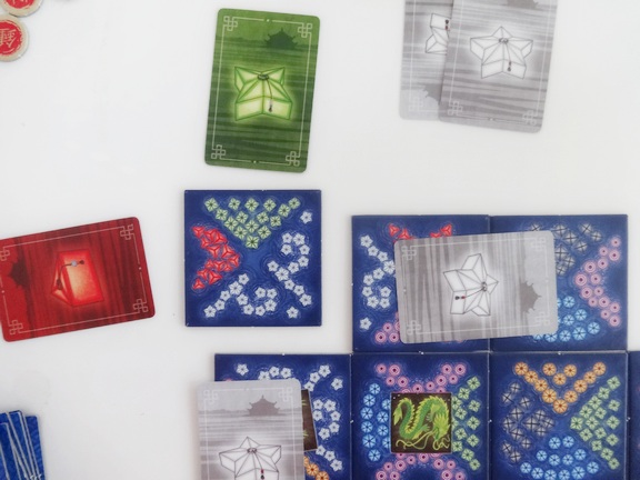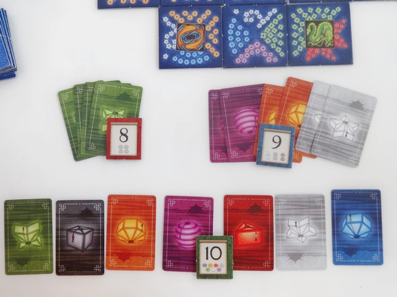 Разные фрагменты необязательно состыковывать по цвету, но если цвет все-таки совпал (на фото выше цвет совпал с двух сторон - белый), то игрок, который выложил такой квадрат, дополнительно получает карточку с фонариком совпавшего цвета (в моем примере - дополнительно два белых). Таким образом можно брать в свой ход несколько карт фонариков. А зачем эти фонарики вообще собирать, спросите вы. А из них необходимо составлять узоры-сеты и получать за это победные очки.