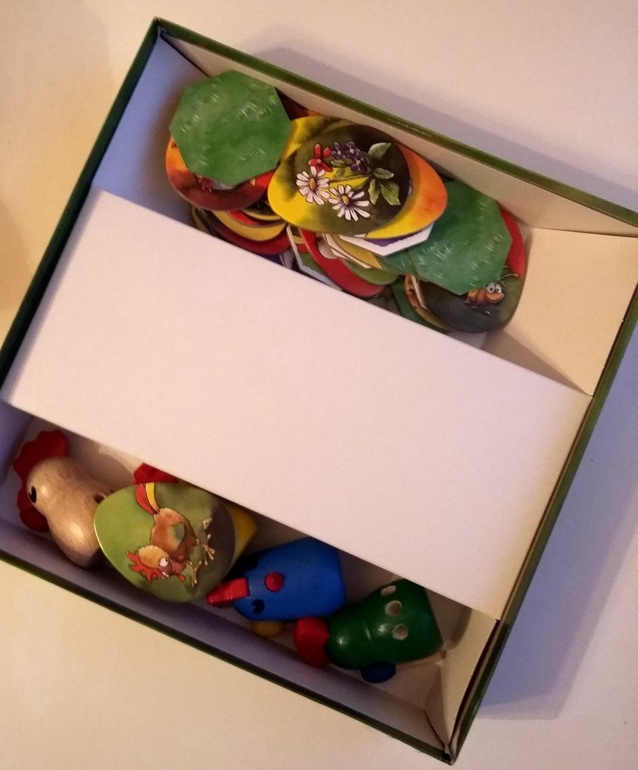Внутри инструкция на русском и на других языках. Деревянные цыплята-петушки. А так же основное содержимое. 12 пар карточек-фигурок, в великолепном качестве и иллюстрациями. А также 12 многоугольников с повторяющимися картинками.