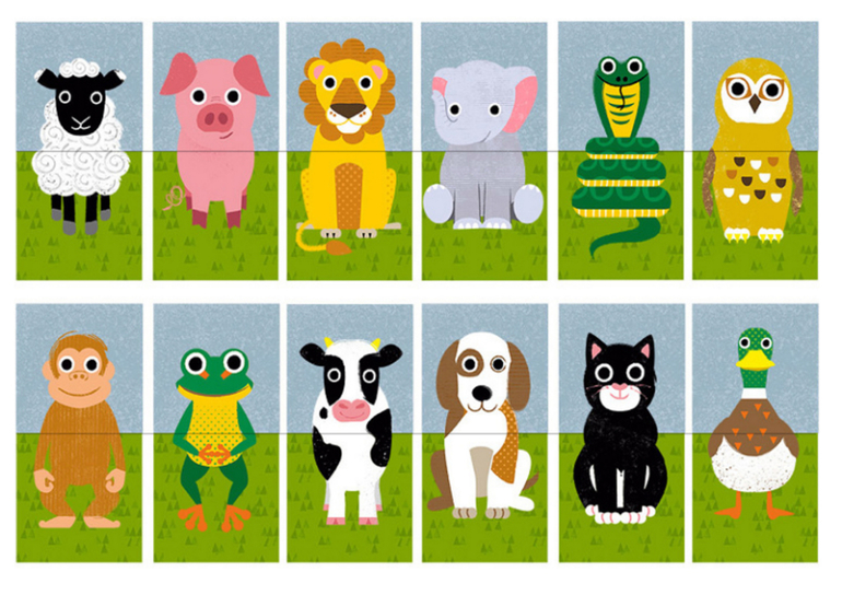 Создайте забавных животных, соединив попарно все таблички «туловище» и «голова». Игрок открывает первую карточку из стопки. Если это голова животного, то игроки должны как можно скорее найти животное с такой же головой и издать крик животного, тело которого лежит под ней. И наоборот - если выпало туловище, нужно издать крик животного, голова которого лежит над этим туловищем.