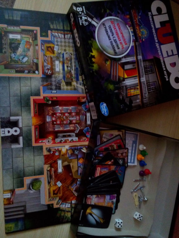 Возраст 8+ , приобрели недавно, с удовольствием играем втроем, она от трех игроков. Детективная игра с двумя игровыми полями. Нужно расследовать дело и ответить на вопросы "Кто?", "Чем?", "Где?".Есть подозреваемые, места преступления и орудия убийства. На фото половина игрового поля. Качество исполнения достойное.