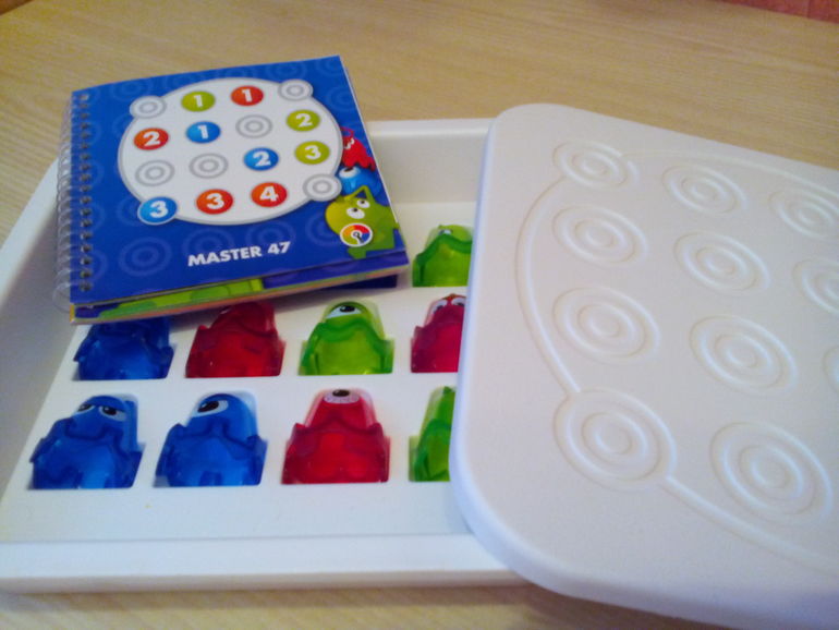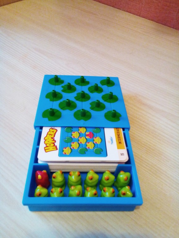 В свое время была очень популярна у дочери, лет в 7, но поскольку все уровни заданий пройдены уже не раз, последнее время почти не достается, но изредка замечаю у нее в руках. Лягушки прыгают друг через друга по принципу шашек, пока не остается только одна.