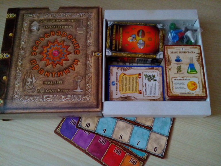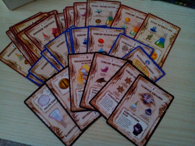 Любимая игра моя и дочери по праву, ну очень увлекательная. Заявленный возраст 10+, мы начинали играть с 7 лет базовой колодой. Игра не быстрая, партия занимает час, полтора. В колоде 76 карт. Нужно создавать наибольшее количество волшебных эликсиров и порошков, сотворить магических существ или талисманы. За каждый элемент зелья или удачно собранный рецепт игрок получает очки.Правила поначалу кажутся сложными, но стоит один раз разобраться и не оторваться. После приобрели два дополнения. Первое - "Университеский курс" ( синяя колода ), второе - "Гильдия алхимиков" ( черная колода), можно соответственно играть двумя одновременно базовой и дополнением ( время игры увеличивается еще на часок ), тремя не пробывали, слишком сложно и долго. Играем вдвоем или втроем. Всем рекомендую, попробуйте поварить часок-другой волшебные зелья!