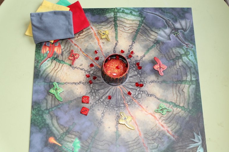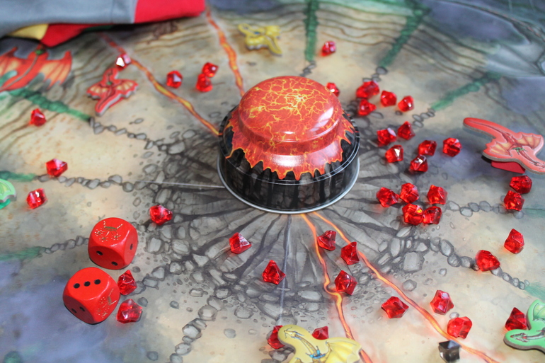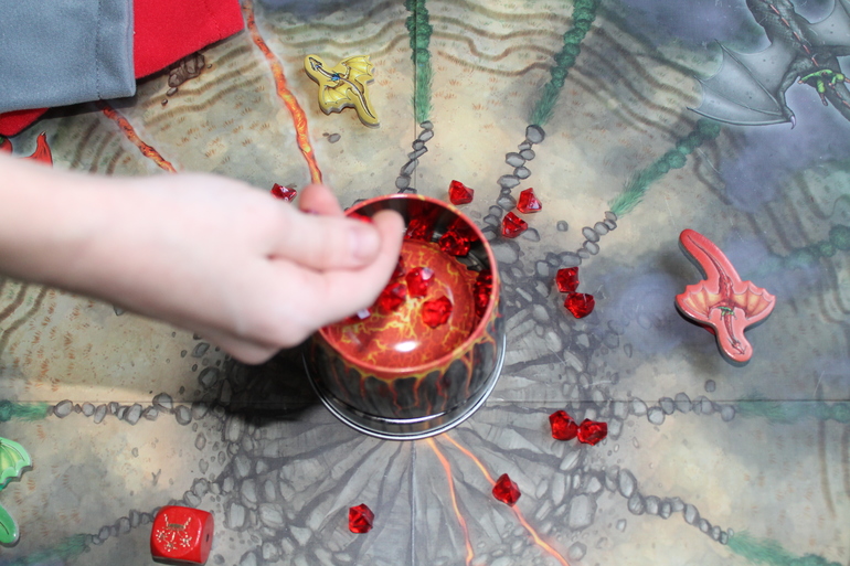 Самый смелый игрок бросает два кубика. Если ни на одном кубике не выпал вулкан, игрок выбирает кубик и облетает вулкан на любом драконе на то количество клеточек, которое выпало на кубике. А второй кубик подсказывает, сколько рубинов надо взять из запаса и бросить их в вулкан.