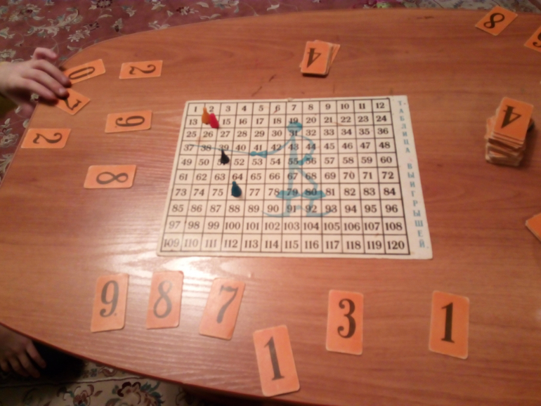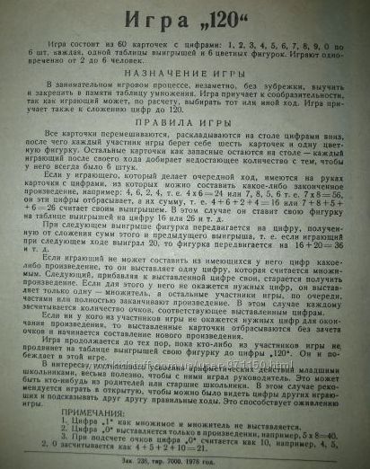 Каждый игрок получает по шесть цифр и на своем ходу должен составить из них (необязательно из всех) пример на умножение. Сумма использованных цифр составляет расстояние, на которое игрок перемещает свою фишку по полю. Побеждает тот, что быстрее остальных доберется 120.