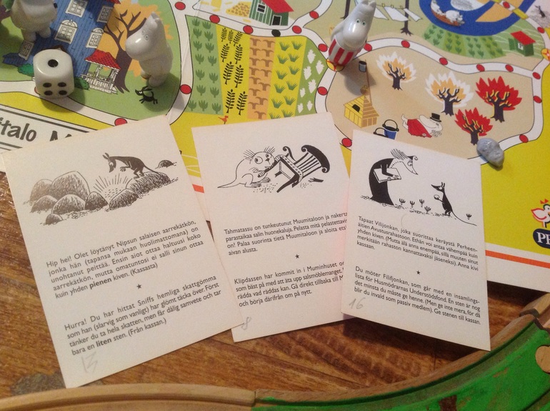 Начинается путь от Муми дома. Ходим по кубику, но вся прелесть игры в том, что куда и каким путем идти игрок определяет сам. По пути игрок может наступить на специально отмеченные кружки ( желтые со звездой) и тогда он берет карточку Муми мамы и выполняет задание на ней. Задания были на финском как и вся игра, и нам пришлось приложить усилия, чтобы добыть перевод, и вот перевод у нас. На каждой карточке своя мини история с персонажами этой истории. Вот смотрите пару примеров.