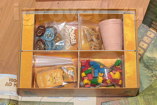 Мне вообще нравятся грамотные органайзеры, Особенно когда в игре много всяких деталей. В этом смысле хороша коробка у 100 тысяч лет до нашей эры. Опять таки фото не мое, но издатель позаботился о нас и вложил в коробку качественные пластиковые пакеты с зип-замком, чтобы мы могли все эти милые деревянные детали игры сложить удобно.