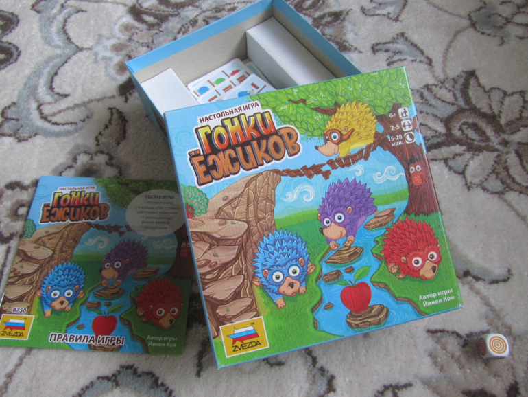 Вообще судя по правилам эта игра рассчитана на детей действительно лет от 6 и старше, даже нам с мужем в неё играть очень интересно )) Эта по сути ходилка, но стратегическая, где надо думать как походить, чтобы твой ёжик изображённый у тебя на карточке пришёл первым. Причём тебе надо привести ёжиков именно в той последовательности как на карточке, то есть например зелёный ёжик должен прийти к финишу первым, серый - вторым, а красный - третьем, и от этого зависит сколько баллов тебе начислят и какое место ты в итоге займёшь )) Моей пятилетке ещё тяжело сразу следить за тремя ёжиками, поэтому мы с ней когда играем вдвоём ведём одного, который должен прийти первым и играем в открытую ( а в правилах карточку показывать нельзя, чтобы соперник не знал, каких ёжиков ты ведёшь к финишу), потому как я иногда подсказываю, как ей лучше походить. В игре четыре кубика с цветами, которые ты кидаешь и можешь три раза перекинуть до выгодной тебе комбинации. В общем игра очень способствует работе извилин и она долгоиграющая, поэтому считаю её просто находкой в мире настольных игр. И да есть у неё более простой аналог для деток помладше - "Черепашьи бега", однако эту считаю более интересной, но это моё субъективное мнение ))