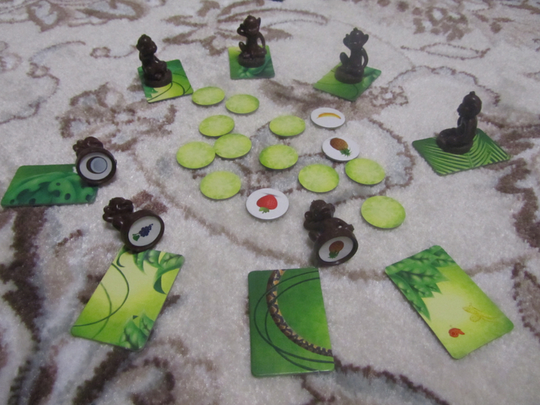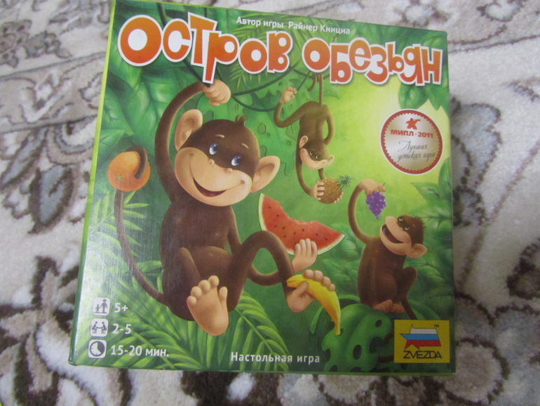 ), подставки -лианы на которых сидят мартышки и жетоны с фруктами. Рассаживаешь обезьянок на лианы и открываешь по одному жетону, у каждой обезьянки на дне изображён фрукт, который она ест, надо угадать-запомнить , где сидит обезьянка,которая например ест виноград, а где - которая ест киви )) Причём одна лиана в кругу остаётся не занятой, если ты открыл обезьянку и не угадал, переставляешь её на свободную лиану. При таких перестановках конечно легко запутаться, где какая обезьянка сидит, поэтому мы с моей пятилетней дочкой переставляем обезьянок раз через раз или в конце, когда жетонов остаётся совсем мало - как говорится для остроты игры )) Победитель тот, кто соберёт больше жетонов с фруктами.