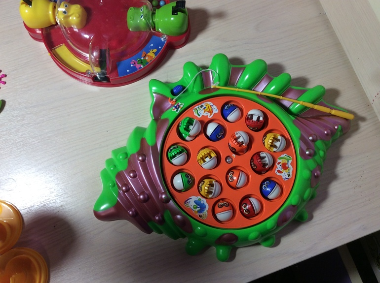 1. Музыкальная рыбалка с удочками. Очень советую, если неудачи не доводят ребёнка до истерики. Моей пять, но не смухливав она рыбку не вытащит. Взрослому тоже надо освоить технику и заставить " руку слушаться". В очередном закрывающемся магазинчике можно найти за 400-500 рублей.