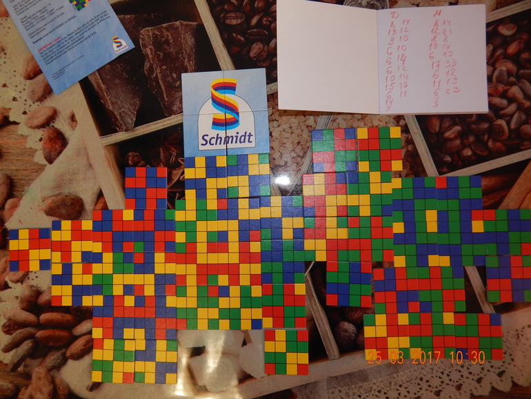 Ход игры: Возьмите 1 карту с верха колоды и положите ее рядом с уже выложенными картами. Карта обязательно должна касаться хотя бы одной стороной других карт, уже лежащих на столе. Старайтесь положить ее так, чтобы образовалось как можно больше цветных цепочек. Цветная цепочка - это квадраты одного цвета, которые соединены своими сторонами (не углами). В цветную цепочку обязательно входят квадраты не менее чем с 2 карточек! Подсчитайте свои очки. Для этого сосчитайте квадратики в тех цветных цепочках, что образовались в Ваш ход: сколько квадратов из Вашей карточки участвовало в образовании цветных цепочек + те квадраты, что попали в цветные цепочки с карт, уже лежащих на столе
