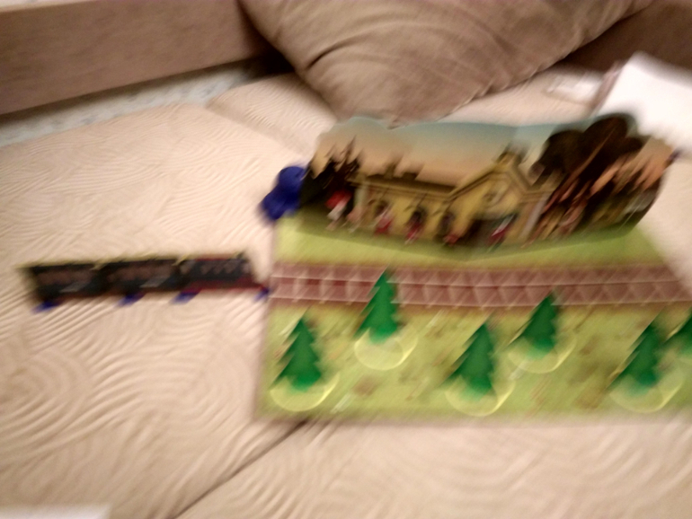Большая квадратная коробка, очень толстое картонное поле, поезд, елки, карточки.