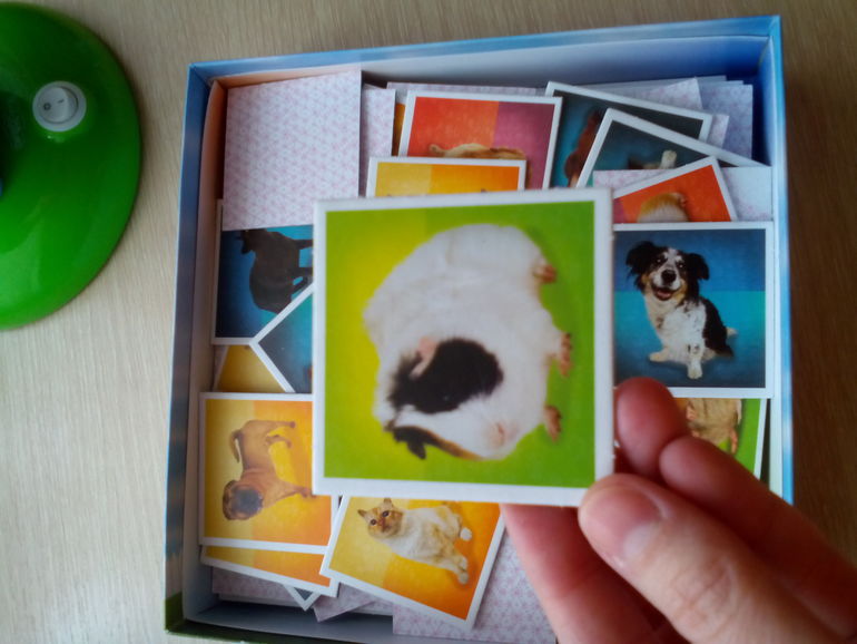 "МЕМО" присматривала давно, рассматривала разные варианты, для начала остановилась на Мемо от Тактик. Тематика животных малышу интересна, карточки плотные, хорошего качества, матовые, но достаточно яркие. Обращаю внимание, что представлены только домашние питомцы: хомяки, рыбки, поросята, кролики, черепахи, попугаи, много разных пород кошек и собак. По отзывам для кого-то это был минус, хотелось разнообразия в видах, но для меня есть плюс. Поскольку сын в неполные три не может еще полноценно играть в мемо, будем начинать с трех-четырех пар, постепенно усложняя, а пока трудится над подбором пар и этот вариант усложняет игру, так как на одинаковом фоне есть похожие породы кошек или собак и для него это не так легко.