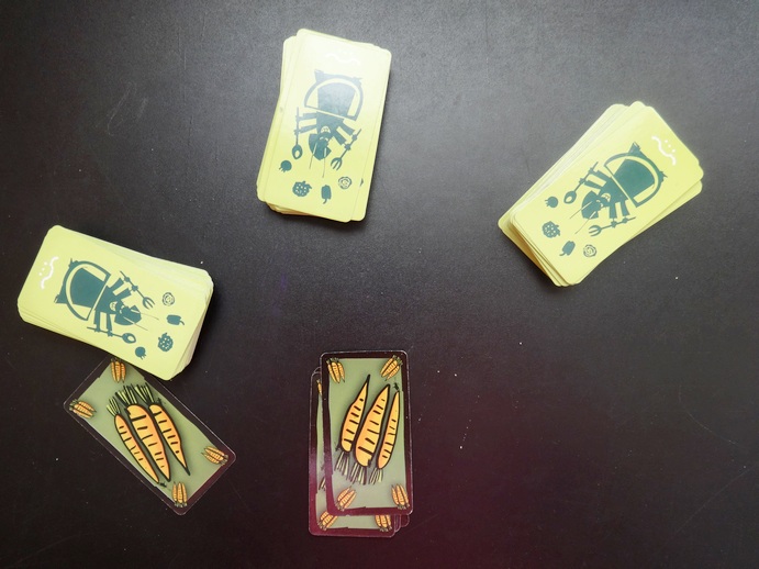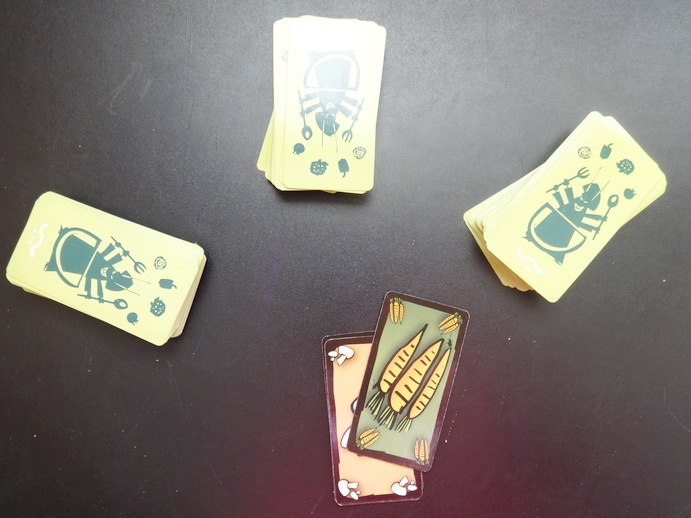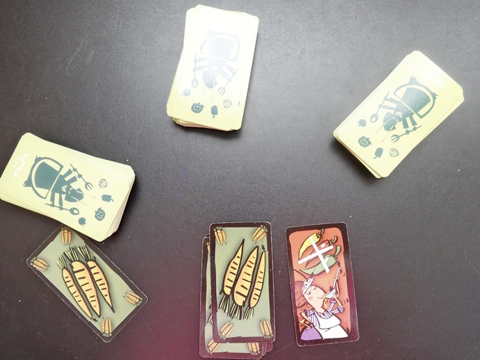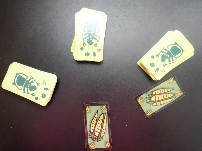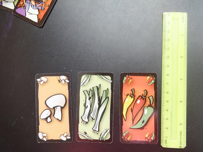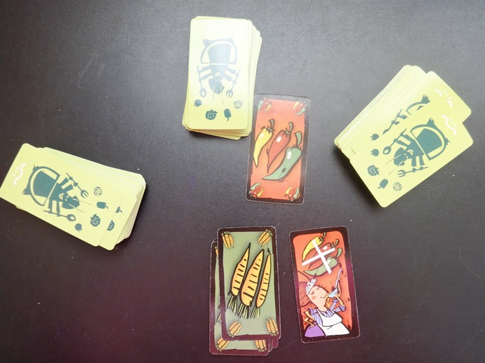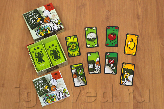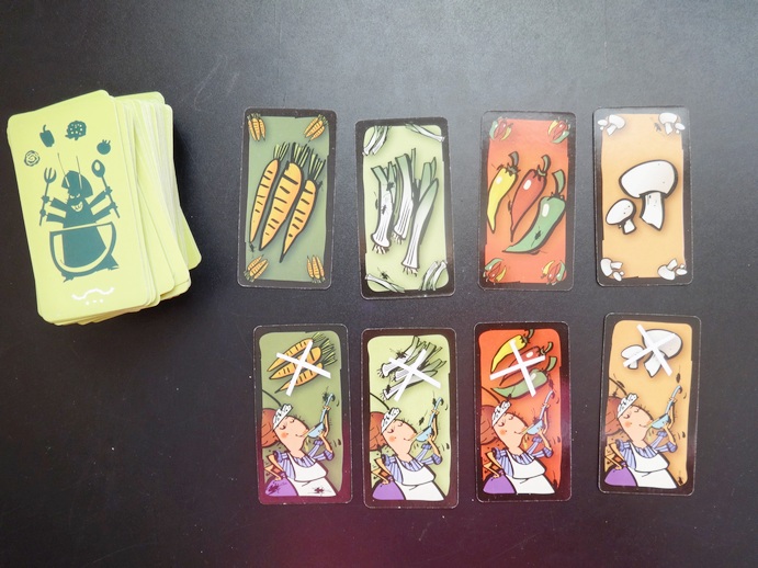 Несмотря на внушительное количество, видов карт в колоде всего 8 - 4 вида овощей (морковь, лук, перец, грибы), таких карт большинство, и запретные карты с тараканом - их по 4 с каждым видом овоща, то есть всего 16.