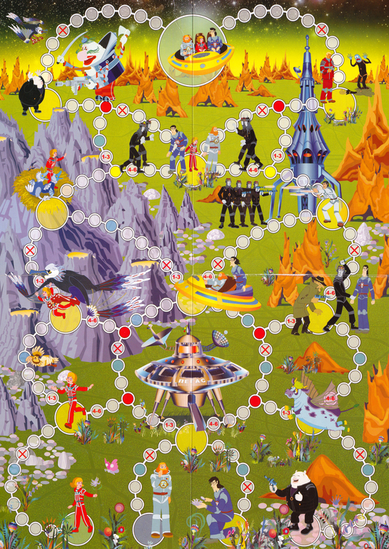 - Знак ИКС. Игрок бросает кубик, и выпавшее количество баллов показывает номера участников. На них происходят выбросы «чёрной» отрицательной энергии, и они погибают. Например, на кубике выпало 3, все космонавты на участках с этим номером погибают, а участники сбрасывают по карте с одним из членов своего экипажа. Ход переходит к следующему участнику.