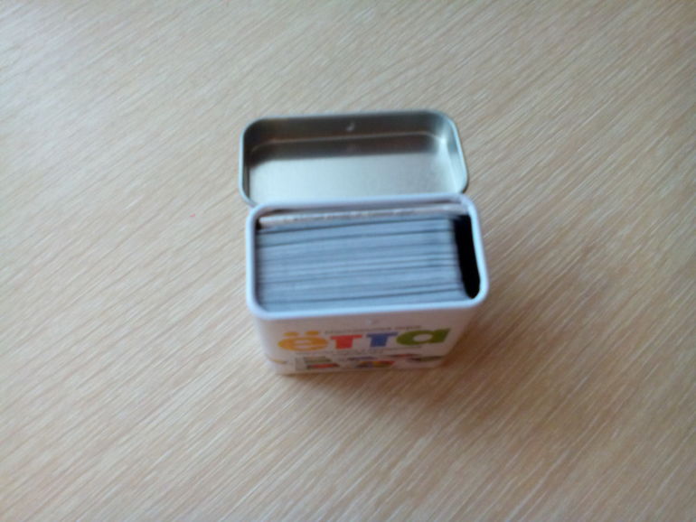 Ну в очень компактной жестяной коробочке плотно располагаются 66 квадратных карточек, из них 2 карточки джокера и правила игры.