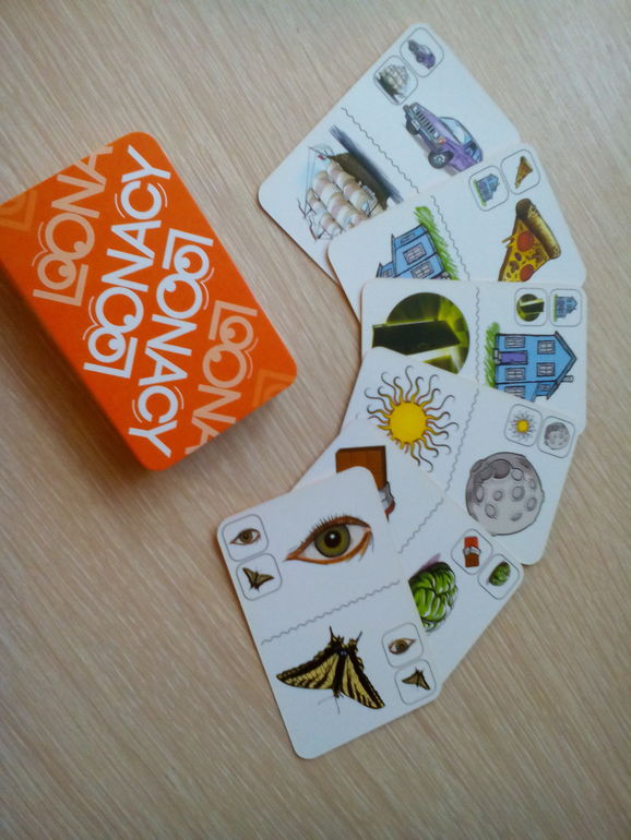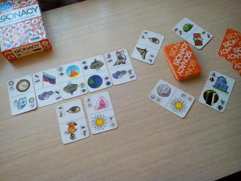 Цель игры - быстрее других избавится от карт на руке, тут главное вовремя замечать одинаковые рисунки. На каждой карте их два, и они же дублируются в левом верхнем углу, это очень удобно, когда держишь карты веером.