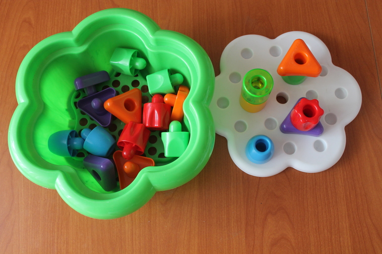 Мозаика для самых маленьких. Элементы имеют разную форму и цвет, в некоторых из них даже есть маленькие гремящие шарики.