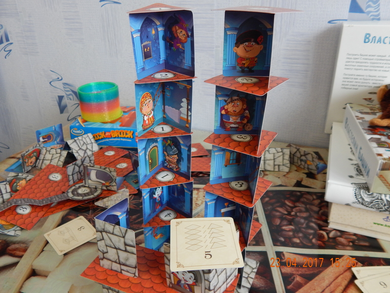 Нижняя платформа изогнута, постройки на ней шатаются-качаются, ночь под прессом не спасла ситуацию, Картон очень тонкий, лестницы долго не прослужат, карточки на столько легкие, что сын кричит: «Не дышите», даже если мы находимся в другой комнате. Тематика убивает без ножа - рыцари, вампиры, короли, цари и царевны, фараоны, ведьмы в одном флаконе - приводят в недоумение. Мой вердикт вам понятен из моих слов - это первая и последняя игра Selfie Media в нашей коллекции. А вот сыну очень понравилась игра, «чем бы дитя не тешилось, лишь бы не плакало», весь день строит башенки и подсчитывает очки.