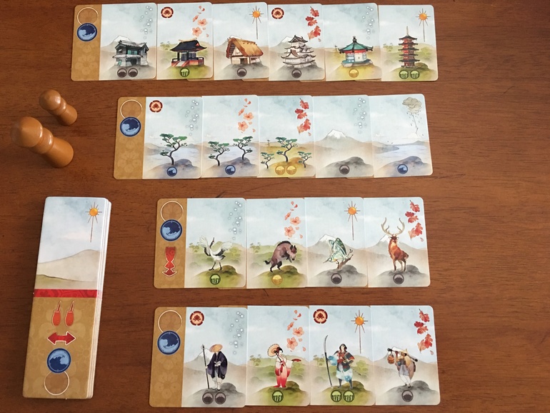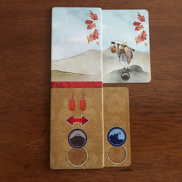 Итак, Канагава - это игра на сбор сетов. Каждый игрок получает по две фигурки кистей и стартовому тайлу, где в верхней части будет Полотно, а в нижней - Студия.