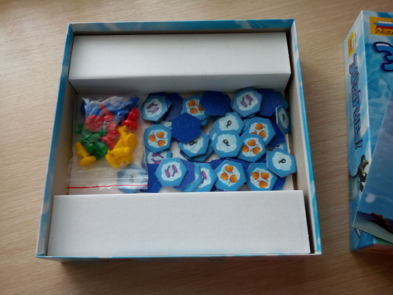 В коробке пластмассовые пингвинчики четырех цветов в количестве 16 шт., и шестиугольные тайлы льдинки 60 шт. Размер коробки конечно неоправданно велик.
