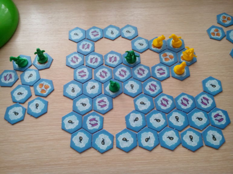 Начинается рыбная ловля. Ход передается по очереди. В свой ход игрок перемещает одного из своих пингвинов на другую льдинку, двигаться можно в любом направлении по прямой линии на любое количество тайлов, при этом та льдинка с которой начинается движение забирается игроком себе. Это и есть улов. Перепрыгивать другие стоящие на пути фигурки нельзя, так же как и перепрыгивать образующиеся свободные места. Те льдинки, которые остались оторванными, до которых невозможно добраться - выбывают из игры. Если вам некуда больше двигаться - рыбалка закончена, вы забираете своих пингвинов и льдинки на которых они стояли, при этом если у соперника остались варианты ходов он доигрывает. Далее идет подсчет очков, считается сумма рыбок, нарисованных на льдинках.