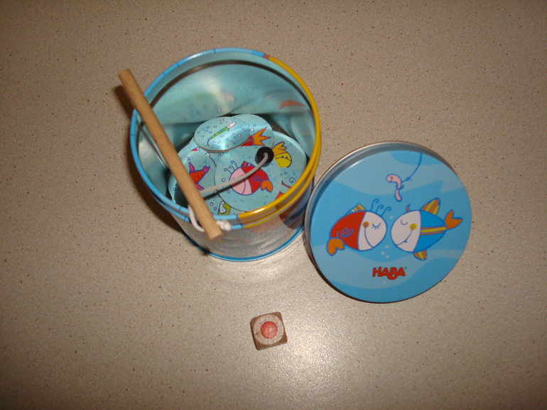 Кидаем кубик и ловим «рыбку», соответствующую цвету кубика. Если же поймана «рыбка» другого цвета или игрок коснулся удочкой стенок банки, ход переходит к следующему игроку. При этом, чтобы подманить к поверхности «рыбку» нужного цвета, баночку разрешается встряхивать неограниченное число раз.