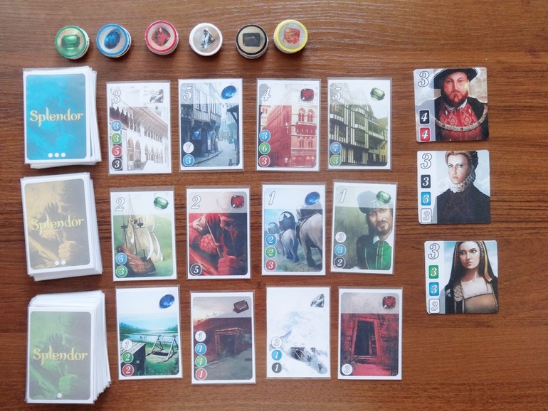 А теперь немного о самой игре. Я уже писала, что мы любим игры на сборы сетов, поэтому Роскошь пришлась нам ко двору. Так выглядит раскладка перед началом игры - 3 колоды с цветными рубашками, открыты по 4 карты из каждой. Выложены жетоны вельмож по количеству игроков + еще один. Количество фишек камней тоже зависит от количества игроков. Всю партию мы будем окружены роскошью, изумруды, рубины, сапфиры, бриллианты, ониксы и золото будут сверкать в наших руках.
