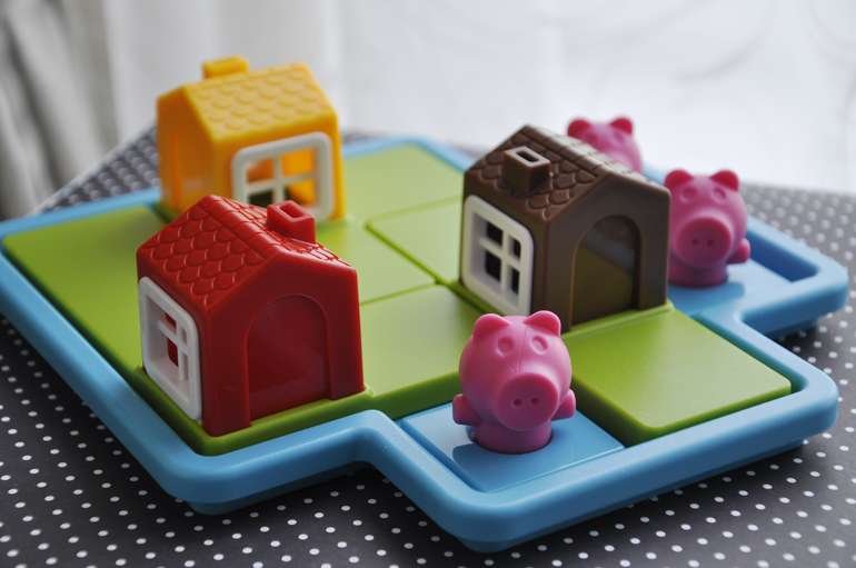 В чём суть? Есть два варианта игры. Первый - когда волка нет и нужно разместить на поле одновременно и поросят и домики. И второй вариант - когда волк на поле. Тогда размещённых поросят нужно спрятать внутри домика.