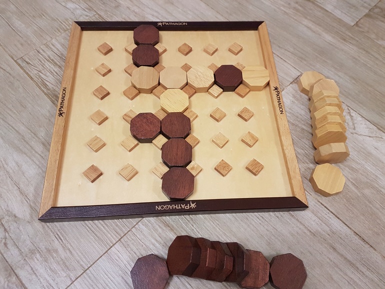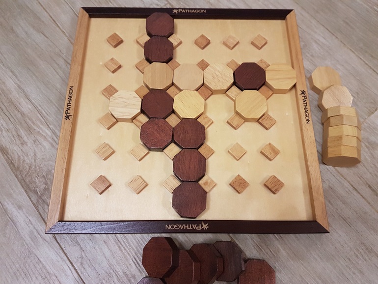 У каждого игрока по 14 фишек своего цвета, из которых нужно выложить непрерывную дорожку, соединяя противоположные края игрового поля. Игрок с темными фишками идет от темного края поля к темному, игрок со светлыми фишками - от светлого к светлому.