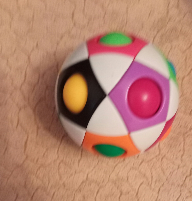 Небольшой, но достаточно увесистый шарик, внутри которого несколько цветных шариков, которые нужно переместить в отверстия сооветствующего цвета. Вообщем то ничего сложного, но на меня очень успокаивающе действует само перекатывание и щелканье шариков. Для дочки тоже трудности не представляет, но она тоже любит пощелкать) дает мне, чтоб я запутала, а она потом распутывает. Для повышения сложности можно только два шарика не в нужные отверстия поместить. На головоломке указан возраст с 4 лет, но мой двухлетка, нет, конечно, не собирает, но разбирать любит) обычно дает мне, чтоб я все верно собрала, а потом сам запутывает) хотя хочу сказать, что нужно приложить усилие, шарики достаточно туго двигаются, но у него получается) Еще он любит его просто катать, и даже пару раз кинул... ничего не отлетело, крепкая головоломка!да, и цвета можно поучить, повторить) так что я обычно снимаю стресс, когда он спит) иначе отнимает)