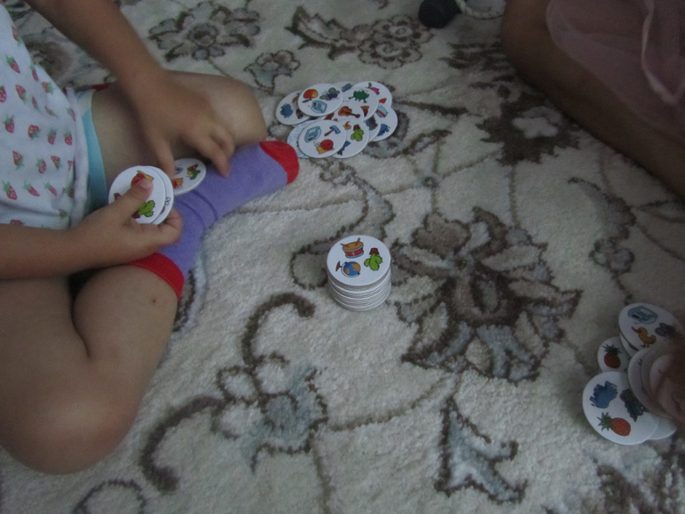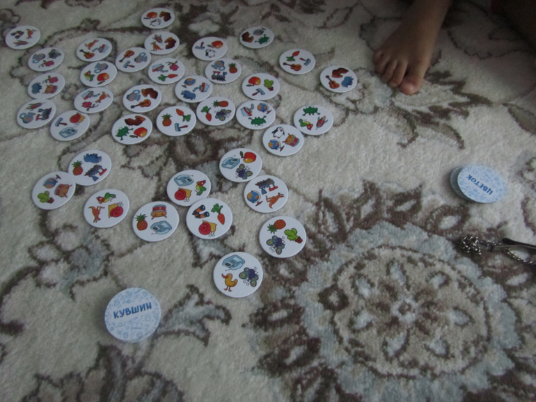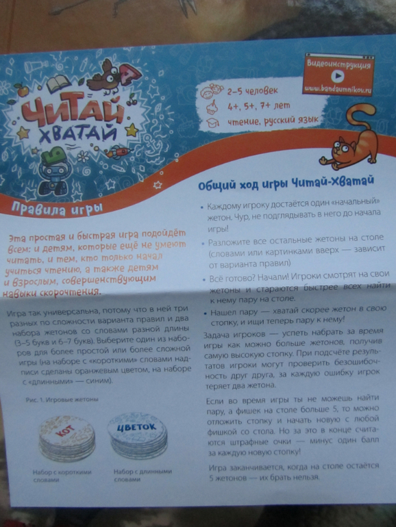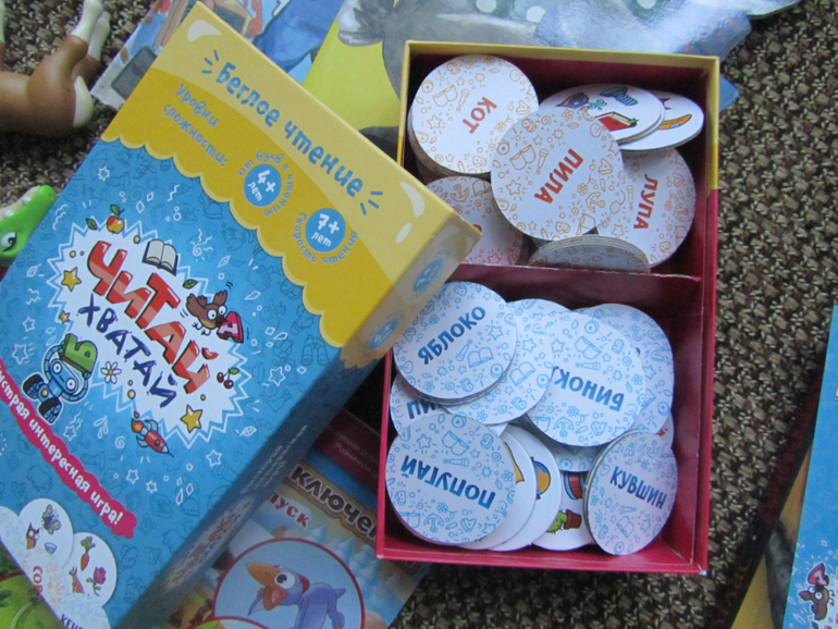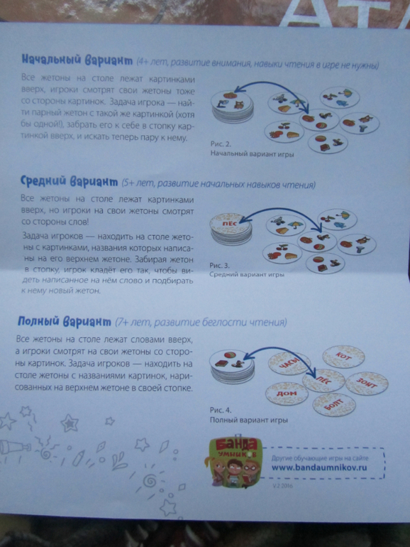 )Как всегда у игр этой серии три уровня сложности и вы знаете даже мой трёхлетний сын с удовольствием играет в первый уровень, где собственно навыки чтения не нужны, а нужна скорость реакции и внимательность )). В игре круглые жетончики и чем то напоминает она мне одновременно и Доббль и Перемешку...А вот второй и третий уровень сложности подразумевает уже, что ребёнок может читать, есть жетончики с короткими словами (лампа, мяч и др.,), а есть с более длинными (робот, кувшин др.). Суть игры очень проста: раскладываешь все жетончики картинками вверх, берёшь один себе и переворачиваешь, на обороте написано слово и именно этот написанный предмет игрок ищет на картинках, забирает себе жетончик с ним, переворачивает и снова читает слово и снова ищет написанный предмет на жетончиках. На жетончике всего изображено три предмета, и в первом начальном уровне игры (от 4 лет) надо просто находить на других жетонах один из представленных на твоём жетоне предметов и забирать его себе и так далее. Игра заканчивается, когда остаётся всего 5 открытых жетонов, выигрывает тот, кто успеет больше набрать себе жетонов, мы с детьми даже не считаем их порой, а просто сравниваем горки жетонов по высоте, у кого стопочка выше , тот и выиграл ))) Игра довольно азартная, её можно даже усложнить, например используя песочные часы )) Игра отличнейшая, детям нравится очень, смело рекомендуем её )))
